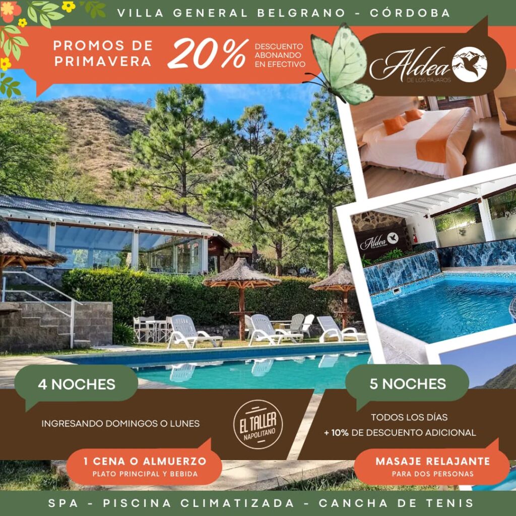 Amplias y Exclusivas Cabañas completamente equipadas, Piscina climatizada indoor con hidromasaje, spa con servicio de masajes & sauna seco, pileta externa de temporada, dos jacuzzis climatizados outdoor y cancha de tenis; todo sobre la falda de las sierras chicas a metros de la entrada principal de Villa General Belgrano